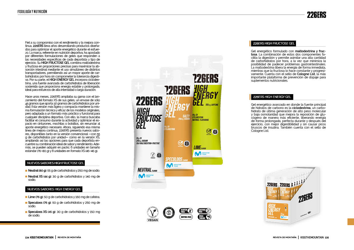 Fiel a su compromiso con el rendimiento y la mejora continua, 226ERS lleva años desarrollando productos diseñados para optimizar el aporte energético durante el esfuerzo. La marca, referente en nutrición deportiva, ha apostado por diferentes formulaciones de geles que responden a las necesidades específicas de cada deportista y tipo de ejercicio. Su HIGH FRUCTOSE GEL combina maltodextrina y fructosa en proporciones precisas para maximizar la absorción intestinal mediante el uso simultáneo de distintos transportadores, permitiendo así un mayor aporte de carbohidratos por hora sin comprometer la tolerancia digestiva. Por su parte, el HIGH ENERGY GEL incorpora ciclodextrina, una fuente avanzada de carbohidratos de liberación sostenida que proporciona energía estable y prolongada, ideal para esfuerzos de alta intensidad o larga duración.