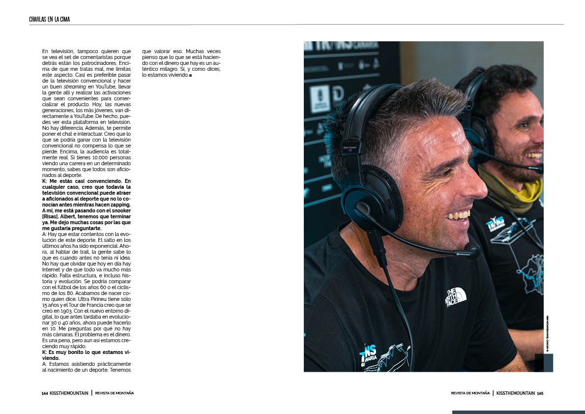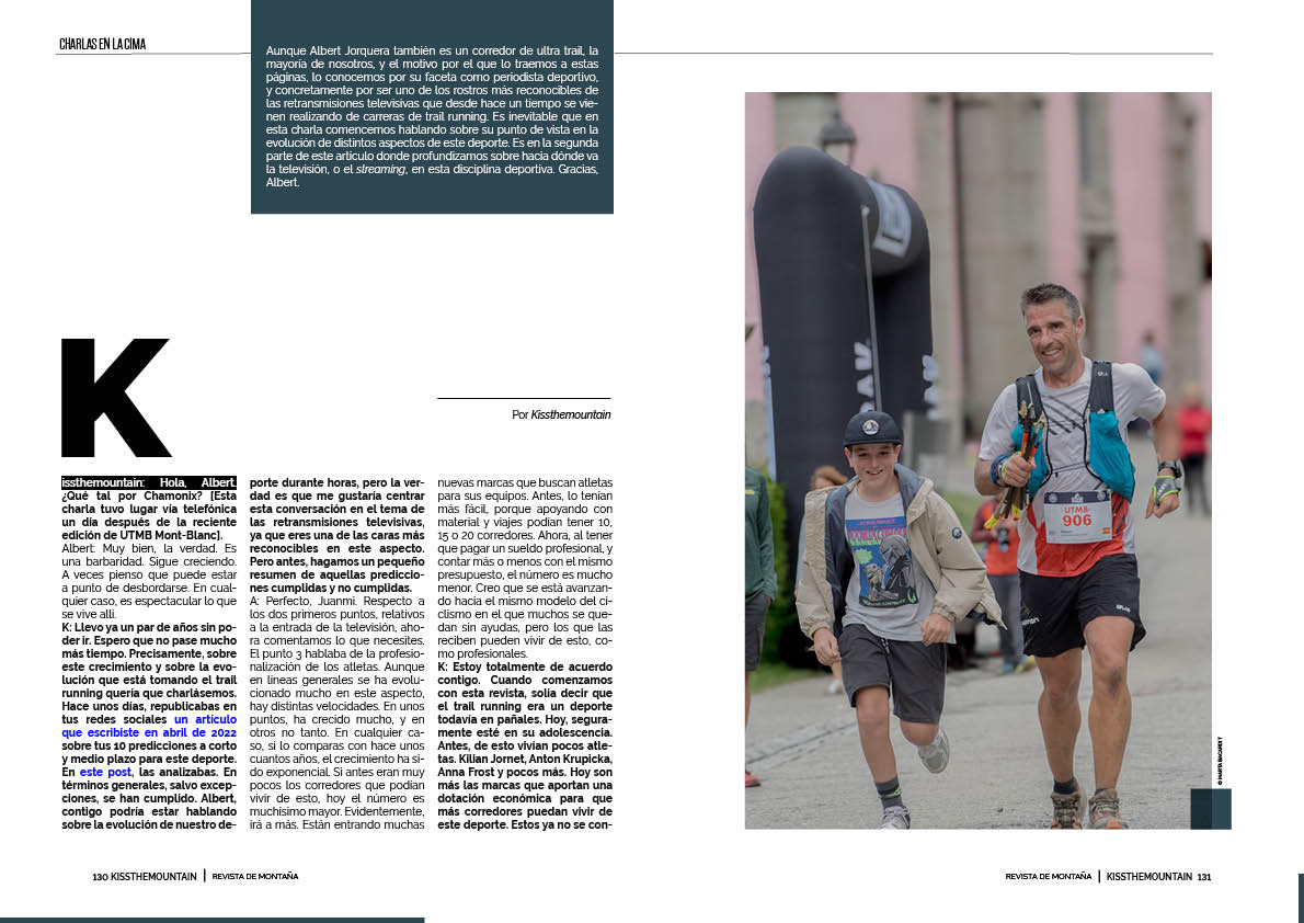 K: Llevo ya un par de años sin poder ir. Espero que no pase mucho más tiempo. Precisamente, sobre este crecimiento y sobre la evolución que está tomando el trail running quería que charlásemos. Hace unos días, republicabas en tus redes sociales un artículo que escribiste en abril de 2022 sobre tus 10 predicciones a corto y medio plazo para este deporte. En este post, las analizabas. En términos generales, salvo excepciones, se han cumplido. Albert, contigo podría estar hablando sobre la evolución de nuestro deporte durante horas, pero la verdad es que me gustaría centrar esta conversación en el tema de las retransmisiones televisivas, ya que eres una de las caras más reconocibles en este aspecto. Pero antes, hagamos un pequeño resumen de aquellas predicciones cumplidas y no cumplidas.