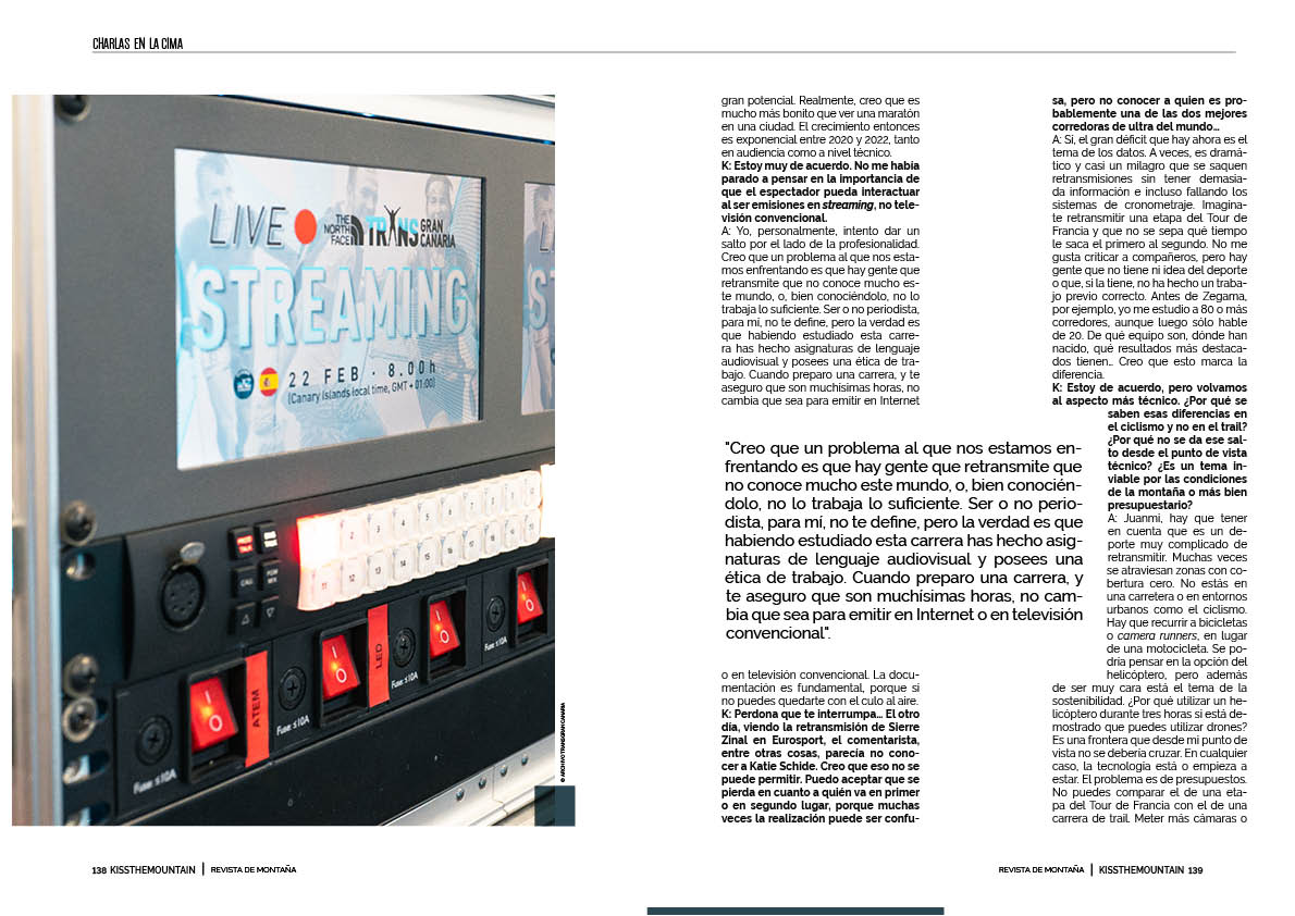 A: Gracias por esas palabras, Juanmi. Antes de la pandemia, se empiezan a hacer los primeros streamings. Los medios eran mucho menores, prácticamente con cámaras fijas y dos comentaristas hablando. Visto hoy, era algo prehistórico. Tras la pandemia, hay un salto importante en las retransmisiones televisivas. El aficionado, desde su casa, puede disfrutar de programas y retransmisiones con una gran evolución tecnológica a precios relativamente baratos si se comparan con producciones televisivas. Es calidad Internet, pero muy alta. Empiezan a utilizarse drones, camera runners. Las tecnologías permiten hacer buenas retransmisiones que hacen que mucho público se enganche al deporte. Yo tengo la suerte de aterrizar ahí en ese momento. Estando en Ibiza, la gente de Arista, organizador de la Transgrancanaria, me propone ir a su carrera. Fue una locura. Estuve solo durante 14 horas, además alternando castellano e inglés. Hubo carencias, pero terminé con la sensación de que se podía emitir una carrera en televisión y que enganchara a gente, con el añadido de que Internet permite la interacción con el público, algo que hicieron muy bien aquellos primeros streamers. Aparece un nuevo consumidor que no es pasivo, sino que puede interactuar con un chat, algo que se agradece y aporta en retransmisiones de más de ocho horas. Muchos se dan cuenta, tanto por la novedad como porque se trata de un deporte realmente atractivo desde el punto de vista visual, que tiene un gran potencial. Realmente, creo que es mucho más bonito que ver una maratón en una ciudad. El crecimiento entonces es exponencial entre 2020 y 2022, tanto en audiencia como a nivel técnico.
