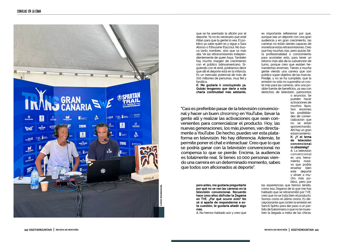A: La televisión convencional es una herramienta masiva que podría enseñar bien este deporte y atraer a mucho más público, pero por las experiencias que hemos tenido, como esa Zegama de la que me has hablado que se retransmitió por TVE, creo que no se trata bien el producto. Somos como el último mono. Es decepcionante que corten la emisión en Sancti Spiritu para dar paso a un partido de balonmano o que no te muestren la llegada a meta de las chicas. En televisión, tampoco quieren que se vea el set de comentaristas porque detrás están los patrocinadores. Encima de que me tratas mal, me limitas este aspecto. Casi es preferible pasar de la televisión convencional y hacer un buen streaming en YouTube, llevar la gente allí y realizar las activaciones que sean convenientes para comercializar el producto. Hoy, las nuevas generaciones, los más jóvenes, van directamente a YouTube. De hecho, puedes ver esta plataforma en televisión. No hay diferencia. Además, te permite poner el chat e interactuar. Creo que lo que se podría ganar con la televisión convencional no compensa lo que se pierde. Encima, la audiencia es totalmente real. Si tienes 10.000 personas viendo una carrera en un determinado momento, sabes que todos son aficionados al deporte.