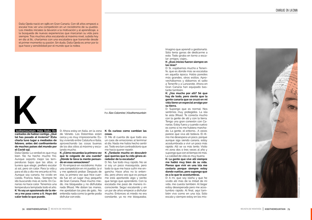 aila Ojeda nació en 1981 en Gran Canaria. Con 18 años empezó a escalar tras ver una competición en un rocódromo de su pueblo. Los miedos iniciales la llevaron a la motivación y al aprendizaje, a la búsqueda de nuevas experiencias que marcarían su vida para siempre. Tras muchos años escalando al máximo nivel, subida hoy en día al 8c, charlamos con una escaladora que transmite desde el primer momento su pasión. Sin duda, Daila Ojeda es amor por lo que hace y sensibilidad por el mundo que la rodea.