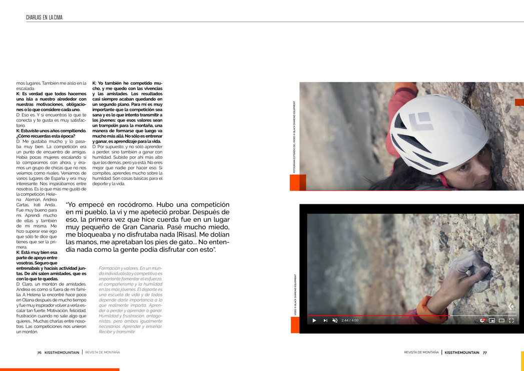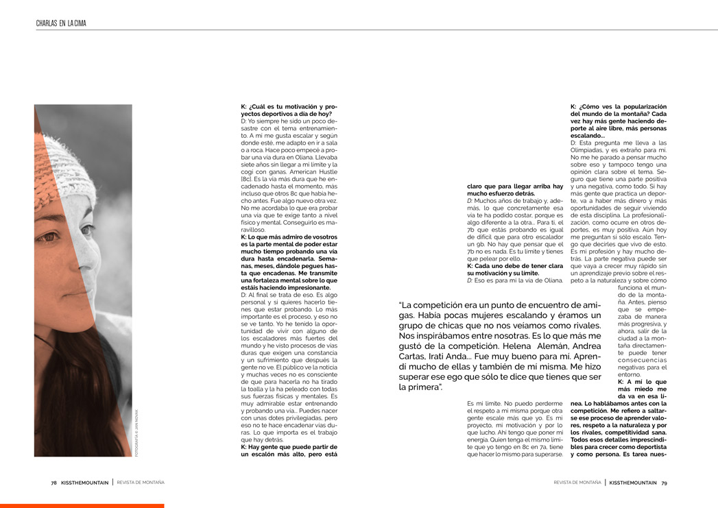 D: Yo soy mala consejera [Risas]. Para mí lo más importante siempre ha sido disfrutar de lo que hago, divertirme cuando escalo y aprovechar todo lo que tengo alrededor. Estar con todos los sentidos a tope. Cuando escalas eres un privilegiado. Estás en un sitio bonito, con gente distinta y de muchos lugares. Es una sensación mágica. Que disfruten de la experiencia que aporta la escalada como deporte y de la oportunidad de conocerse a uno mismo y a otras personas. Aprender de otra gente, de la naturaleza…
