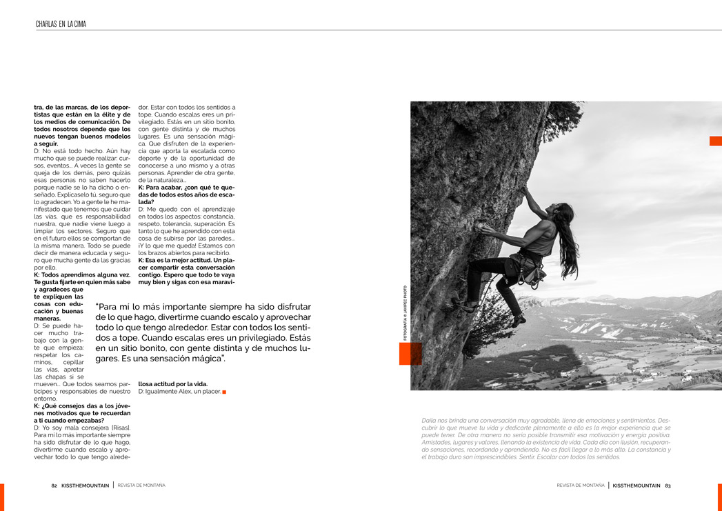 Daila nos brinda una conversación muy agradable, llena de emociones y sentimientos. Descubrir lo que mueve tu vida y dedicarte plenamente a ello es la mejor experiencia que se puede tener. De otra manera no sería posible transmitir esa motivación y energía positiva. Amistades, lugares y valores, llenando la existencia de vida. Cada día con ilusión, recuperando sensaciones, recordando y aprendiendo. No es fácil llegar a lo más alto. La constancia y el trabajo duro son imprescindibles. Sentir. Escalar con todos los sentidos.