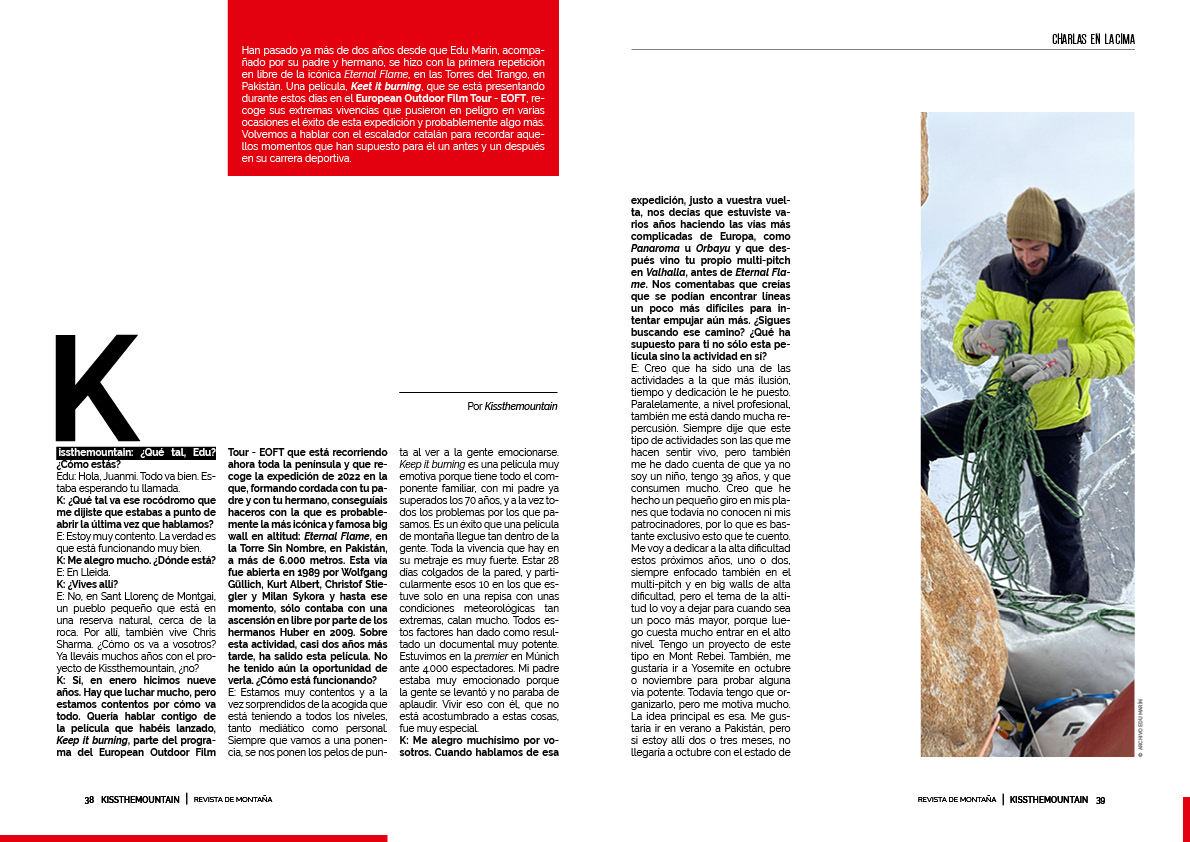Han pasado ya más de dos años desde que Edu Marín, acompañado por su padre y hermano, se hizo con la primera repetición en libre de la icónica Eternal Flame, en las Torres del Trango, en Pakistán. Una película, Keet it burning, que se está presentando durante estos días en el European Outdoor Film Tour – EOFT, recoge sus extremas vivencias que pusieron en peligro en varias ocasiones el éxito de esta expedición y probablemente algo más. Volvemos a hablar con el escalador catalán para recordar aquellos momentos que han supuesto para él un antes y un después en su carrera deportiva.
