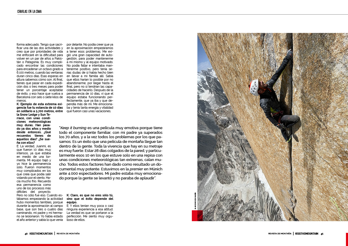 “Keep it burning es una película muy emotiva porque tiene todo el componente familiar, con mi padre ya superados los 70 años, y a la vez todos los problemas por los que pasamos. Es un éxito que una película de montaña llegue tan dentro de la gente. Toda la vivencia que hay en su metraje es muy fuerte. Estar 28 días colgados de la pared, y particularmente esos 10 en los que estuve solo en una repisa con unas condiciones meteorológicas tan extremas, calan mucho. Todos estos factores han dado como resultado un documental muy potente. Estuvimos en la premier en Múnich ante 4.000 espectadores. Mi padre estaba muy emocionado porque la gente se levantó y no paraba de aplaudir”.