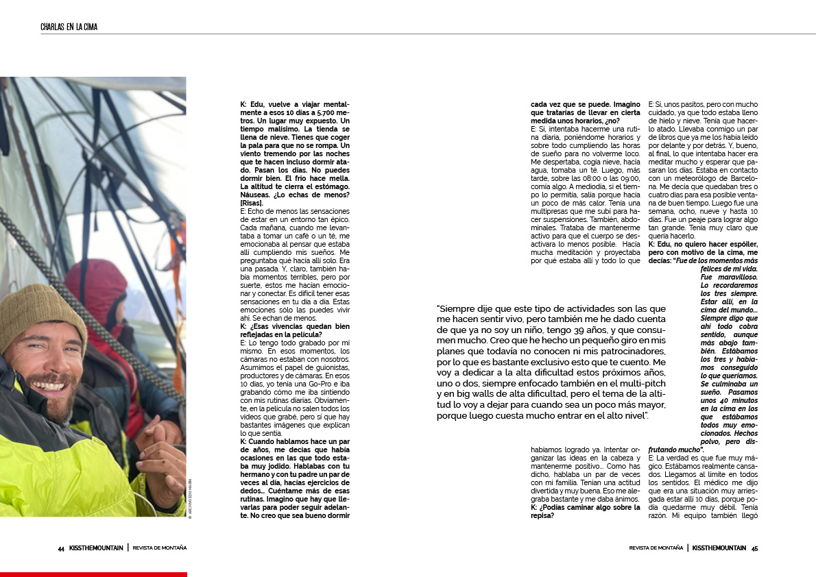K: Edu, no quiero hacer espóiler, pero con motivo de la cima, me decías: “Fue de los momentos más felices de mi vida. Fue maravilloso. Lo recordaremos los tres siempre. Estar allí, en la cima del mundo… Siempre digo que ahí todo cobra sentido, aunque más abajo también. Estábamos los tres y habíamos conseguido lo que queríamos. Se culminaba un sueño. Pasamos unos 40 minutos en la cima en los que estábamos todos muy emocionados. Hechos polvo, pero disfrutando mucho”.
