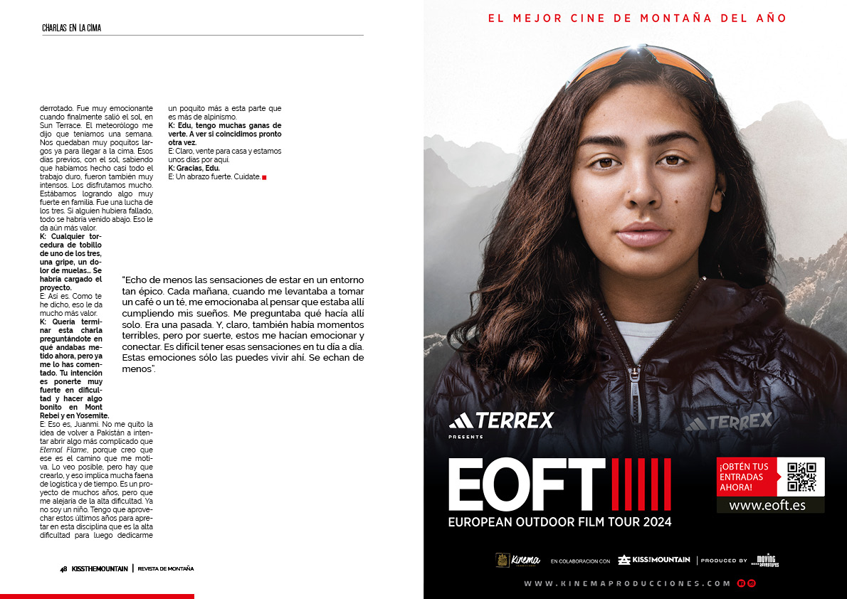 E: Eso es, Juanmi. No me quito la idea de volver a Pakistán a intentar abrir algo más complicado que Eternal Flame, porque creo que ese es el camino que me motiva. Lo veo posible, pero hay que crearlo, y eso implica mucha faena de logística y de tiempo. Es un proyecto de muchos años, pero que me alejaría de la alta dificultad. Ya no soy un niño. Tengo que aprovechar estos últimos años para apretar en esta disciplina que es la alta dificultad para luego dedicarme un poquito más a esta parte que es más de alpinismo.