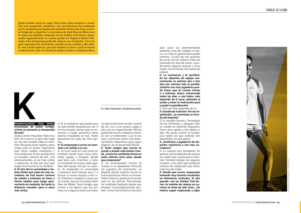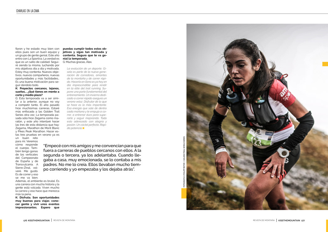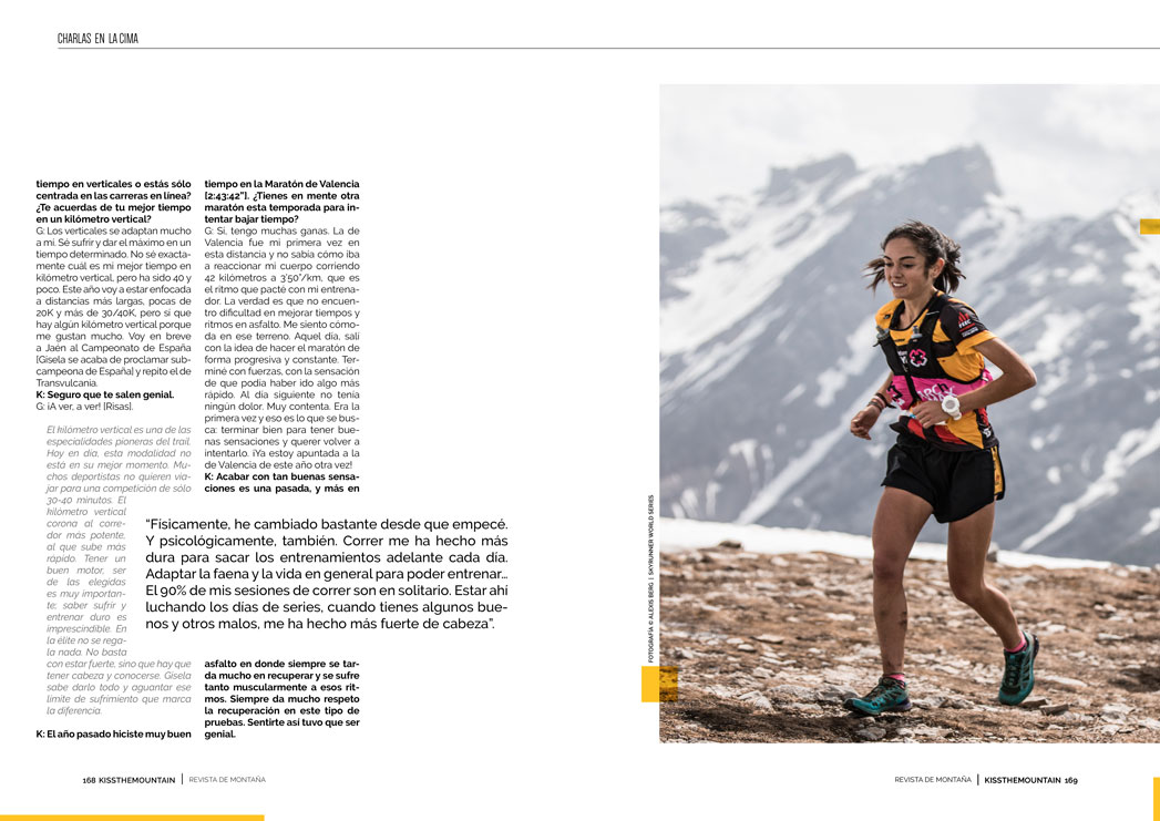El kilómetro vertical es una de las especialidades pioneras del trail. Hoy en día, esta modalidad no está en su mejor momento. Muchos deportistas no quieren viajar para una competición de sólo 30-40 minutos. El kilómetro vertical corona al corredor más potente, al que sube más rápido. Tener un buen motor, ser de las elegidas es muy importante; saber sufrir y entrenar duro es imprescindible. En la élite no se regala nada. No basta con estar fuerte, sino que hay que tener cabeza y conocerse. Gisela sabe darlo todo y aguantar ese límite de sufrimiento que marca la diferencia.