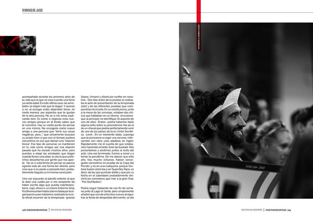 Una vez expuesto el párrafo anterior al que le daré una vuelta por si me arrepiento de haber escrito algo que pueda malinterpretarse, viajo, ahora sí, a Limone Extreme 2019. Kissthemountain había sido invitada por la organización pues habíamos realizado la revista oficial resumen de la temporada -gracias Seana, Vincent y Albert por confiar en nosotros-. Dos días antes de la prueba se realizaba el acto de presentación de la temporada 2020 y de las diferentes pruebas que compondrían el circuito. En un cóctel previo, junto a la mesa de las cervezas, estaban dos chicos que hablaban en un idioma -el euskera- que al principio no identifiqué. El aspecto de uno de ellos -Eneko- podría haberme dado alguna pista sobre su procedencia. No así el de un chaval que podría perfectamente venir de uno de los países de la ex Unión Soviética -Jurek-. En un momento dado, supongo que al acercarme a coger una cerveza, intercambié con ellos unas palabras en inglés. Rápidamente me di cuenta de que estábamos haciendo el tonto. Eran de Euskadi. Nos presentamos y asistimos juntos al resto del acto. Una vez terminado, fuimos a cenar y a tomar la penúltima. Allí me dijeron que este año, tras mucho esfuerzo, habían conseguido convertirse en prueba de la Copa del Mundo, y no en una cualquiera, porque Gorbeia Suzien 2020 iba a ser SuperSky Race, es decir, de las que puntúan doble y que por su fecha en el calendario probablemente dirimiría los corredores que irían a la gran final, “The SkyMasters”.