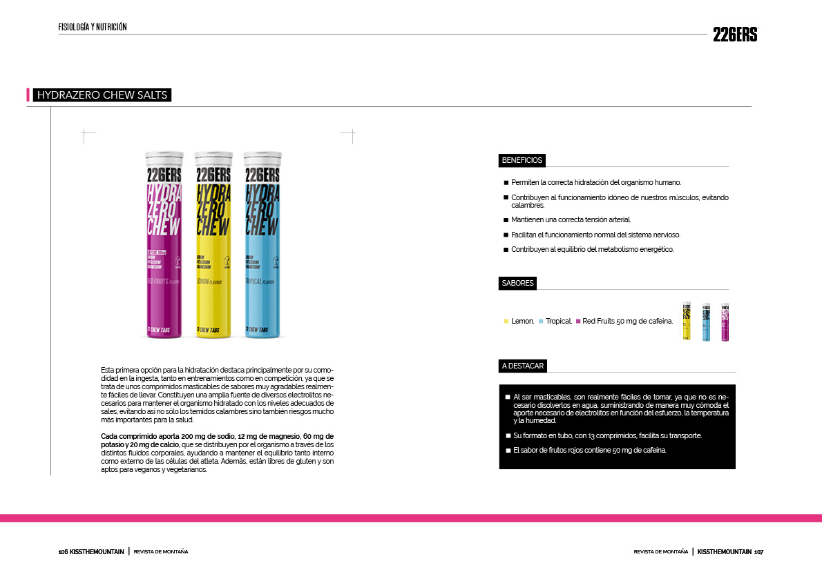 Esta primera opción para la hidratación destaca principalmente por su comodidad en la ingesta, tanto en entrenamientos como en competición, ya que se trata de unos comprimidos masticables de sabores muy agradables realmente fáciles de llevar. Constituyen una amplia fuente de diversos electrolitos necesarios para mantener el organismo hidratado con los niveles adecuados de sales, evitando así no sólo los temidos calambres sino también riesgos mucho más importantes para la salud.