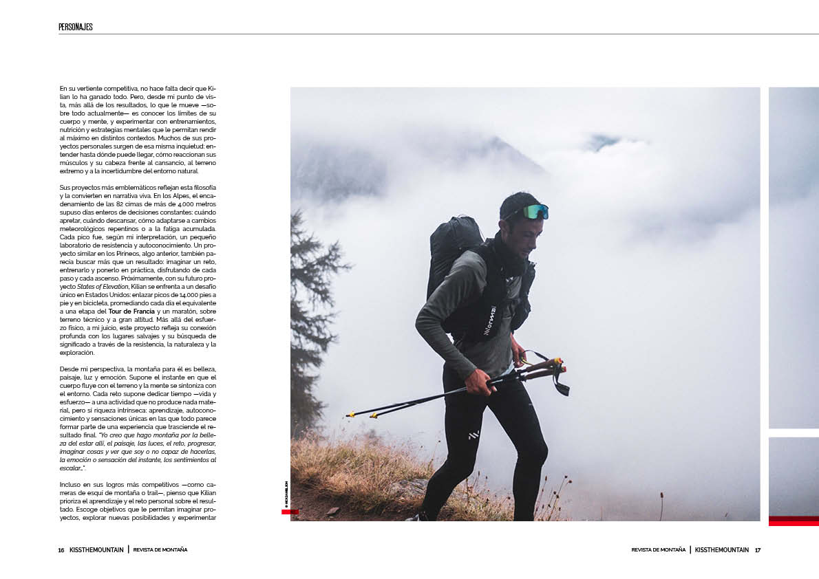 En su vertiente competitiva, no hace falta decir que Kilian lo ha ganado todo. Pero, desde mi punto de vista, más allá de los resultados, lo que le mueve —sobre todo actualmente— es conocer los límites de su cuerpo y mente, y experimentar con entrenamientos, nutrición y estrategias mentales que le permitan rendir al máximo en distintos contextos. Muchos de sus proyectos personales surgen de esa misma inquietud: entender hasta dónde puede llegar, cómo reaccionan sus músculos y su cabeza frente al cansancio, al terreno extremo y a la incertidumbre del entorno natural.