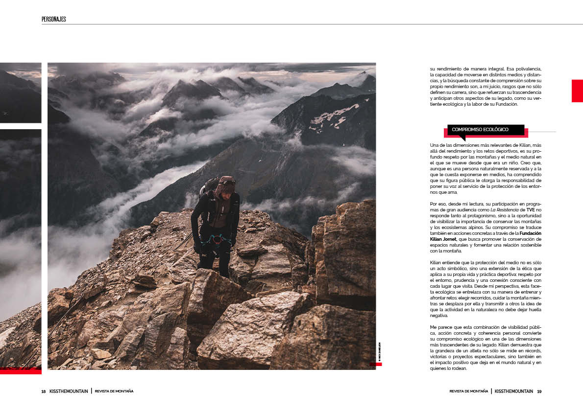 Incluso en sus logros más competitivos —como carreras de esquí de montaña o trail—, pienso que Kilian prioriza el aprendizaje y el reto personal sobre el resultado. Escoge objetivos que le permitan imaginar proyectos, explorar nuevas posibilidades y experimentar su rendimiento de manera integral. Esa polivalencia, la capacidad de moverse en distintos medios y distancias, y la búsqueda constante de comprensión sobre su propio rendimiento son, a mi juicio, rasgos que no sólo definen su carrera, sino que refuerzan su trascendencia y anticipan otros aspectos de su legado, como su vertiente ecológica y la labor de su Fundación.