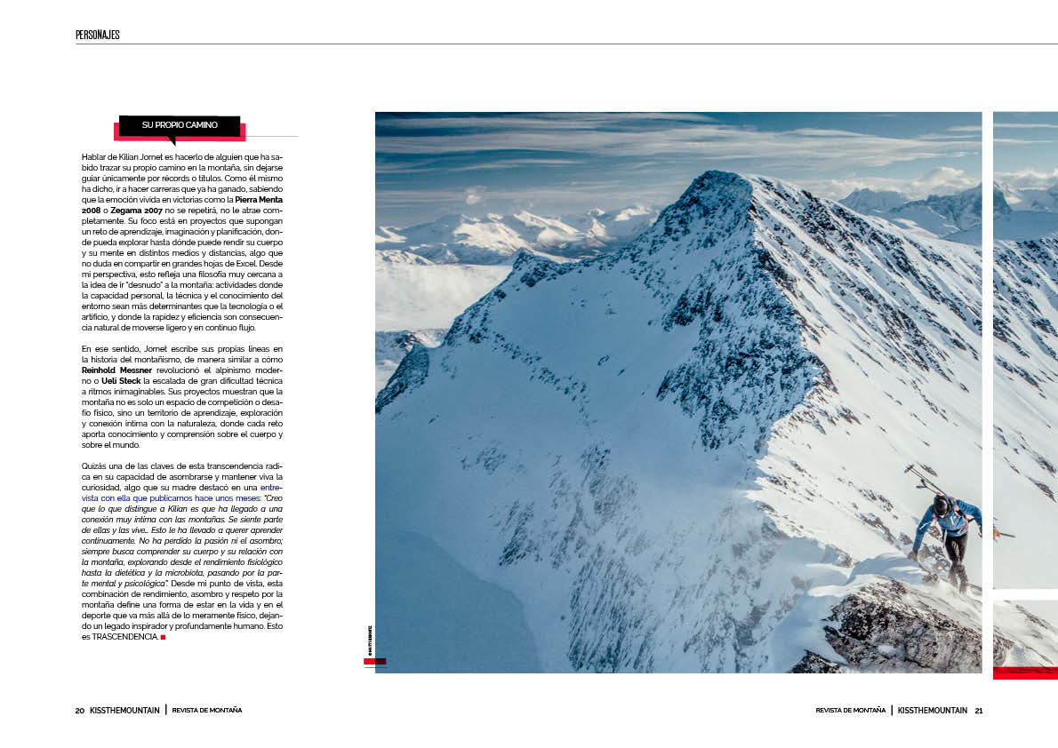 Quizás una de las claves de esta transcendencia radica en su capacidad de asombrarse y mantener viva la curiosidad, algo que su madre destacó en una entrevista con ella que publicamos hace unos meses: “Creo que lo que distingue a Kilian es que ha llegado a una conexión muy íntima con las montañas. Se siente parte de ellas y las vive… Esto le ha llevado a querer aprender continuamente. No ha perdido la pasión ni el asombro; siempre busca comprender su cuerpo y su relación con la montaña, explorando desde el rendimiento fisiológico hasta la dietética y la microbiota, pasando por la parte mental y psicológica”. Desde mi punto de vista, esta combinación de rendimiento, asombro y respeto por la montaña define una forma de estar en la vida y en el deporte que va más allá de lo meramente físico, dejando un legado inspirador y profundamente humano. Esto es TRASCENDENCIA.