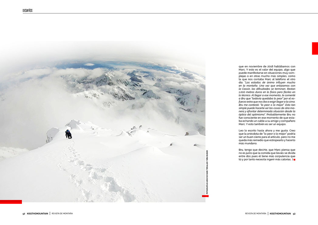 Éstas son palabras de Bru Busom que confirman lo que en noviembre de 2018 hablábamos con Marc. Y esto es el valor del equipo, algo que puede manifestarse en situaciones muy complejas o en otras mucho más simples, como la que nos contaba Marc al teléfono el otro día: “Los estados de ánimo influyen mucho en la montaña. Una vez que enlazamos con la Cassin, las dificultades se terminan. Restan 1.000 metros duros en lo físico pero fáciles en lo técnico. Al llegar a ese momento, le comenté a Bru que “todavía quedaba lo peor” por el esfuerzo extra que nos iba a exigir llegar a la cima. Bru me contestó: “lo peor o lo mejor”. Esto tan simple puede hacerte ver las cosas de otra manera y afrontar determinada situación desde la óptica del optimismo”. Probablemente Bru no fue consciente en ese momento de que estaba echando un cable a su amigo y compañero Marc. Y esto también es ser un equipo.