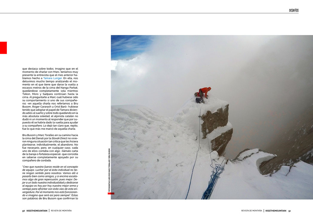 Imagino que en el momento de charlar con Marc, teníamos muy presente la entrevista que el mes anterior habíamos hecho a Tamara Lunger. En ella, nos detuvimos mucho tiempo analizando el momento en el que tiene que darse la vuelta a escasos metros de la cima del Nanga Parbat, quedándose completamente sola mientras Txikon, Moro y Sadpara continúan hasta la cima. Al preguntarle a Marc cuál hubiese sido su comportamiento si uno de sus compañeros -en aquella charla nos referíamos a Bru Busom, Roger Cararach u Oriol Baró- hubiese tenido que adoptar el papel de Tamara diciendo adiós al sueño y sobre todo quedando en la más absoluta soledad, el alpinista catalán no dudó ni un momento al responder que por supuesto él se habría dado la vuelta para ayudar a su compañero. Lo dejó tan claro que, repito, fue lo que más me marcó de aquella charla.