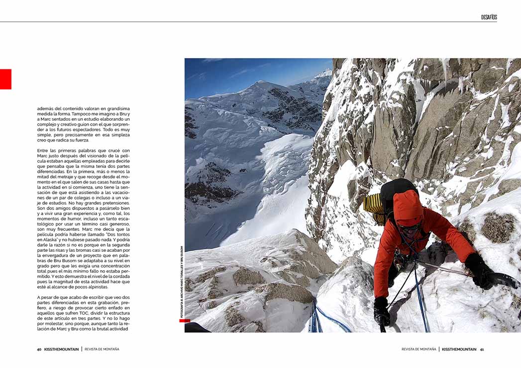 Hay un momento en la película que me gusta especialmente. Bru y Marc están llegando a la cima después de una última jornada en la que tienen que ascender 1.000 metros de desnivel, una vez que se enlaza con la Cassin. Bru ha abierto la traza durante toda la jornada. Marc se detiene y deja que sea Bru quien haga cima en primer lugar dándole tiempo, “su” tiempo. No sé si porque se da cuenta de lo que han realizado, por un cansancio extremo de cinco días de actividad en los que sólo ingieren algo de avena por la mañana, un par de barritas durante el día y comida liofilizada durante la noche, o por una mezcla de todo, pero Marc se echa a llorar de emoción viendo a Bru en la cima. Es, más o menos, el minuto 47 de la película. “Más que la escalada que es de flipar, hay una historia humana muy fuerte detrás de todo. Mucha gente puede verla como la de dos superhéroes que suben un sitio, pero realmente somos dos colegas que se van de fin de semana a escalar. Uno se tira un pedo y el otro se ríe. El título podría ser el de Dos tontos en Alaska (“eh tíu, tíu, qué pasa tíu”). Nos une mucho la motivación. Nunca he encontrado a alguien tan motivado en quien su prioridad sea sólo escalar y meterse en donde sea por encima de muchas cosas. Llegar allí no es gratis. Somos dos pringados que tenemos que currar. No podíamos ni tan siquiera tomarnos una pizza mientras esperábamos el equipaje perdido. En ese momento, cuando has alcanzado el objetivo, sale, entre muchas otras, este tipo de cosas”.