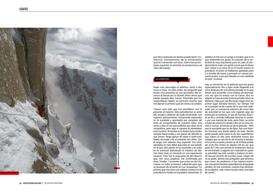 “Fueron unos días que nos permitieron vivir el presente al máximo. Sólo pensábamos en estar allí, escalar y disfrutar de cada movimiento, con nuestros pensamientos únicamente enfocados en la escalada y apartados por completo del resto de componentes de nuestras vidas. Hay veces y días en los que prefieres que abra vía el compañero, pero aquí ni siquiera te planteabas esta cuestión. Te tocaba a ti y tirabas para arriba, siempre hacia arriba y con ganas de afrontar lo que viniera. Tengo ganas de volver a sentir esto. Hablo de poder vivir el presente con Marc. Con él tengo una relación muy especial. Con otros alpinistas es más difícil que entre en ese estado en el que sólo pienso en la escalada y en estar en la aventura disfrutando al máximo de ella. Con Marc todo se convierte en una experiencia superior”. Esta fue la respuesta de Bru Busom que, con otras palabras, fue confirmada por Marc Toralles. Y prometo que entre las dos llamadas no hubo el tiempo suficiente para que se pusieran de acuerdo en sus respuestas: “Lo primero que me viene a la cabeza si pienso en la actividad en Alaska es la palabra vacaciones. El objetivo es irte con un amigo a escalar, que es lo que realmente nos gusta. El conjunto de la actividad es muy importante para mí, pero lo fundamental es subir con gente con la que te llevas bien. Hacer o no cima no es ni mucho menos lo prioritario. Al volver ya habíamos quedado para ir a escalar de nuevo y pensado en nuevos proyectos juntos, y eso que llevaba un mes viéndole la cara”. Amistad.