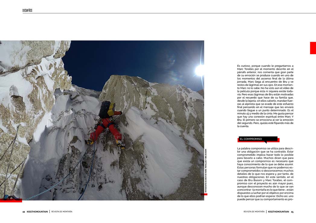 El pasado 10 de abril se estrenó la película de esta actividad de gran repercusión internacional como demuestra el hecho de que, en el momento de escribir estas líneas, en sólo dos semanas, haya superado las 46.000 visualizaciones. Una de ellas, o alguna más, la ha realizado parte del equipo de Kissthemountain. Y en base a nuestras impresiones y a las conversaciones mantenidas con los dos alpinistas hemos querido publicar este artículo que se aleja de consideraciones técnicas -ya publicadas en otros medios- para centrarse en aspectos más humanos y que giran alrededor de la relación entre Marc Toralles y Bru Busom.