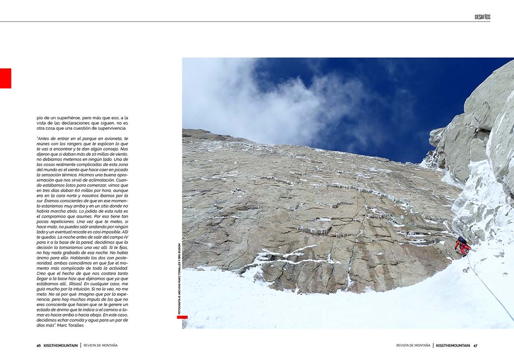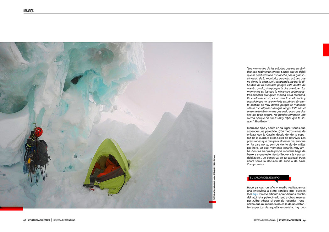 “Antes de entrar en el parque en avioneta, te reúnes con los rangers que te explican lo que te vas a encontrar y te dan algún consejo. Nos dijeron que si daban más de 10 millas de viento, no debíamos meternos en ningún lado. Una de las cosas realmente complicadas de esta zona del mundo es el viento que hace caer en picado la sensación térmica. Hicimos una buena aproximación que nos sirvió de aclimatación. Cuando estábamos listos para comenzar, vimos que en tres días daban 60 millas por hora, aunque era en la cara norte y nosotros íbamos por la sur. Éramos conscientes de que en ese momento estaríamos muy arriba y en un sitio donde no habría marcha atrás. Lo jodido de esta ruta es el compromiso que asumes. Por eso tiene tan pocas repeticiones. Una vez que te metes, si hace malo, no puedes salir andando por ningún lado y un eventual rescate es casi imposible. Allí te quedas. La noche antes de salir del campo IV para ir a la base de la pared, decidimos que la decisión la tomaríamos una vez allí. Si te fijas, no hay nada grabado de esa noche. No había ánimo para ello. Hablando los dos con posterioridad, ambos coincidimos en que fue el momento más complicado de toda la actividad. Creo que el hecho de que nos costara tanto llegar a la base hizo que dijéramos que ya que estábamos allí… [Risas]. En cualquier caso, me guío mucho por la intuición. Si no lo veo, no me meto. No sé por qué. Imagino que por la experiencia, pero hay muchos imputs de los que no eres consciente que hacen que se te genere un estado de ánimo que te indica si el camino a tomar es hacia arriba o hacia abajo. En este caso, decidimos echar comida y agua para un par de días más”. Marc Toralles.