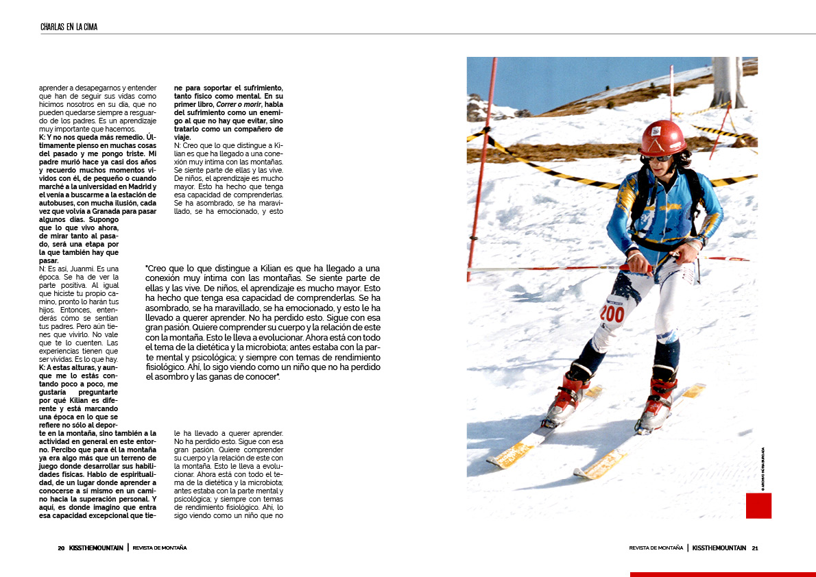 K: Sí, son increíbles y muy interesantes. Conozco alguno de cuando estuvo escribiendo para las dos primeras temporadas de nuestra otra revista, Kissthesnow. Es algo que siempre le agradeceré mucho. Supongo que en esta necesidad de seguir aprendiendo radicará el motivo por el que continúa empujando sus límites y realizando actividades como la de los Alpes, los Pirineos o hace algo más tiempo en el Everest. Te lo digo porque cualquier otro, con todo lo que ha logrado él, y teniendo tres hijas, quizás se plantearía parar.