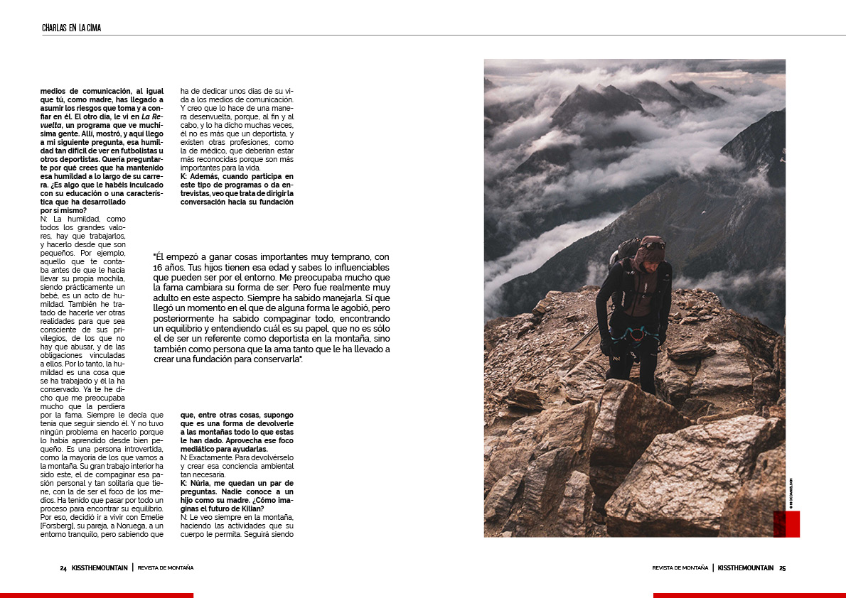 N: La humildad, como todos los grandes valores, hay que trabajarlos, y hacerlo desde que son pequeños. Por ejemplo, aquello que te contaba antes de que le hacía llevar su propia mochila, siendo prácticamente un bebé, es un acto de humildad. También he tratado de hacerle ver otras realidades para que sea consciente de sus privilegios, de los que no hay que abusar, y de las obligaciones vinculadas a ellos. Por lo tanto, la humildad es una cosa que se ha trabajado y él la ha conservado. Ya te he dicho que me preocupaba mucho que la perdiera por la fama. Siempre le decía que tenía que seguir siendo él. Y no tuvo ningún problema en hacerlo porque lo había aprendido desde bien pequeño. Es una persona introvertida, como la mayoría de los que vamos a la montaña. Su gran trabajo interior ha sido este, el de compaginar esa pasión personal y tan solitaria que tiene, con la de ser el foco de los medios. Ha tenido que pasar por todo un proceso para encontrar su equilibrio. Por eso, decidió ir a vivir con Emelie [Forsberg], su pareja, a Noruega, a un entorno tranquilo, pero sabiendo que ha de dedicar unos días de su vida a los medios de comunicación. Y creo que lo hace de una manera desenvuelta, porque, al fin y al cabo, y lo ha dicho muchas veces, él no es más que un deportista, y existen otras profesiones, como la de médico, que deberían estar más reconocidas porque son más importantes para la vida.