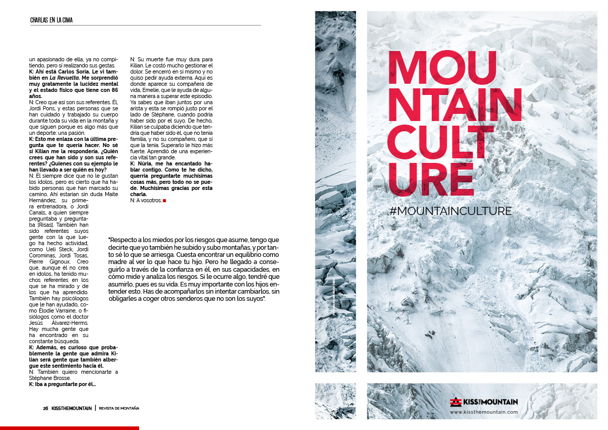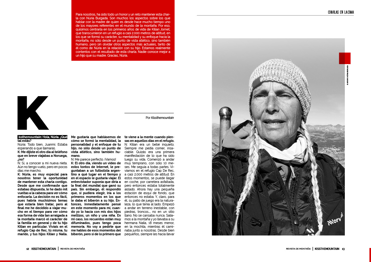 Para nosotros, ha sido todo un honor y un reto mantener esta charla con Núria Burgada. Son muchos los aspectos sobre los que hablar con la madre de quien es desde hace mucho tiempo uno de los mayores referentes en el mundo de la montaña. Por eso, quisimos centrarla en los primeros años de vida de Kilian Jornet, que transcurrieron en un refugio a casi 2.000 metros de altitud, en los que se formó su carácter, su mentalidad y su enfoque hacia la montaña, no sólo desde un punto de vista atlético, sino también humano, pero sin olvidar otros aspectos más actuales, tanto de él como de Núria en la relación con su hijo. Estamos realmente contentos con el resultado de esta charla. Nadie conoce mejor a un hijo que su madre. Gracias, Núria.