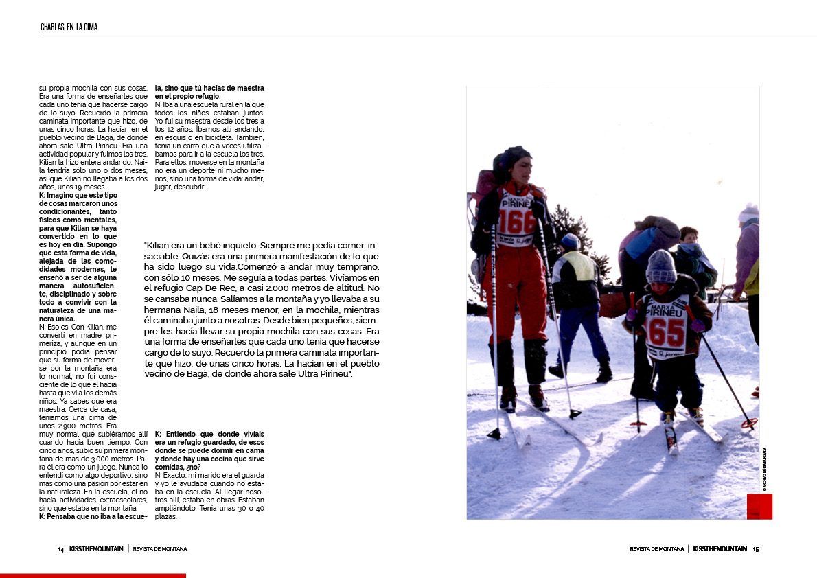 K: Núria, es muy especial para nosotros tener la oportunidad de mantener esta charla contigo. Desde que me confirmaste que estabas dispuesta, le he dado mil vueltas a la cabeza para ver cómo enfocarla. La decisión no es fácil, pues habría muchísimos temas que estaría bien tratar, pero al final me he decidido a viajar mucho en el tiempo para ver cómo esa forma de vida tan arraigada a la montaña marcó el carácter de la familia en general y de tu hijo Kilian en particular. Vivíais en el refugio Cap de Rec, tú misma, tu marido, y tus hijos Kilian y Naila. Me gustaría que hablásemos de cómo se formó la mentalidad, la personalidad y el enfoque de tu hijo, no sólo desde un punto de vista atlético, sino también humano.