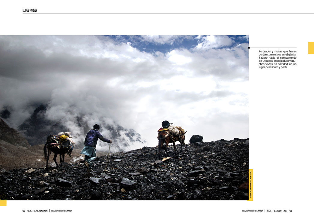 Porteador y mulas que transportan suministros en el glaciar Baltoro hasta el campamento de Urdukas. Trabajo duro y muchas veces en soledad en un lugar desafiante y hostil.