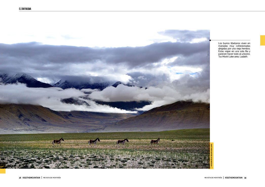Los burros tibetanos viven en manadas muy cohesionadas dirigidas por una vieja hembra. Éstas viajan en una sola fila y parecen hacer todo al unísono. Tso Moriri Lake area. Ladakh.