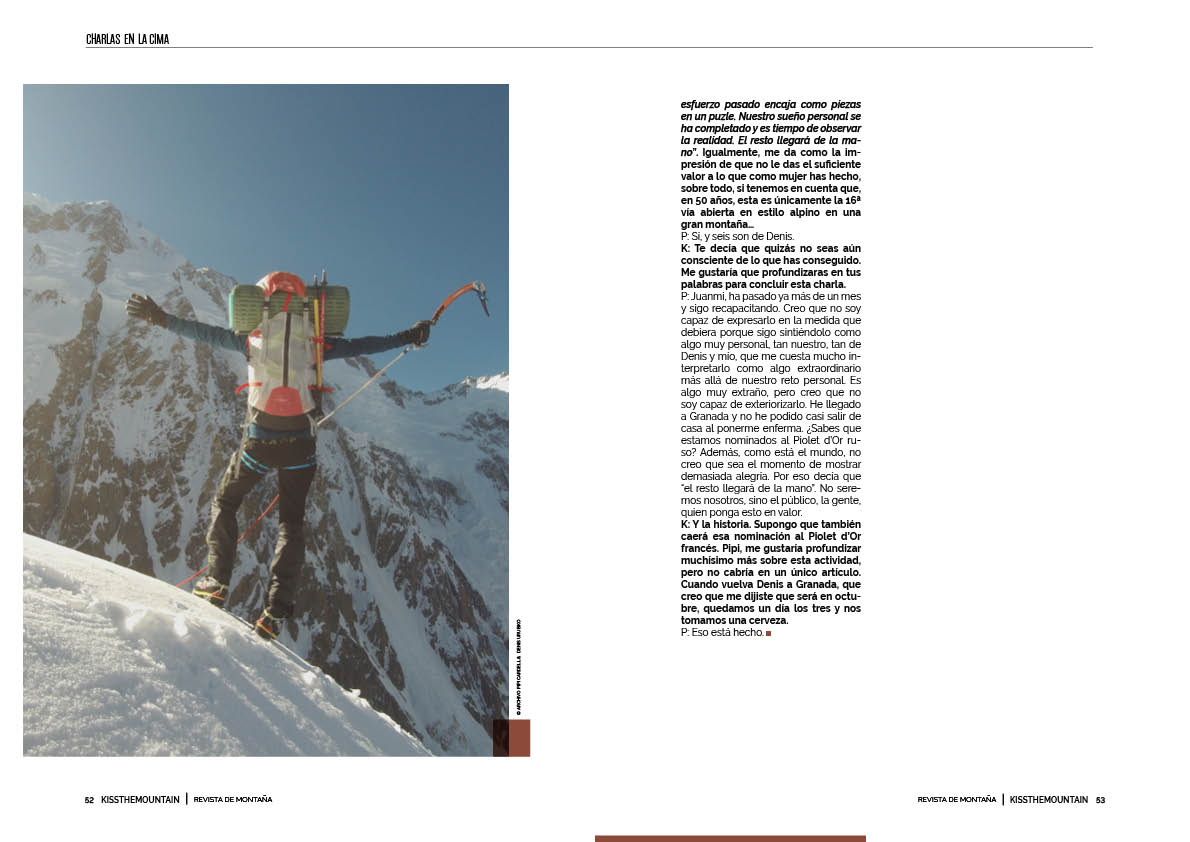 P: Juanmi, ha pasado ya más de un mes y sigo recapacitando. Creo que no soy capaz de expresarlo en la medida que debiera porque sigo sintiéndolo como algo muy personal, tan nuestro, tan de Denis y mío, que me cuesta mucho interpretarlo como algo extraordinario más allá de nuestro reto personal. Es algo muy extraño, pero creo que no soy capaz de exteriorizarlo. He llegado a Granada y no he podido casi salir de casa al ponerme enferma. ¿Sabes que estamos nominados al Piolet d’Or ruso? Además, como está el mundo, no creo que sea el momento de mostrar demasiada alegría. Por eso decía que “el resto llegará de la mano”. No seremos nosotros, sino el público, la gente, quien ponga esto en valor.