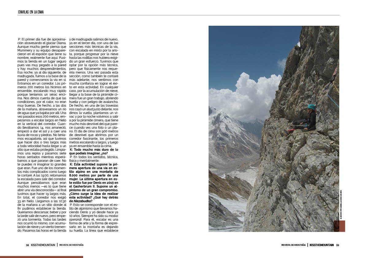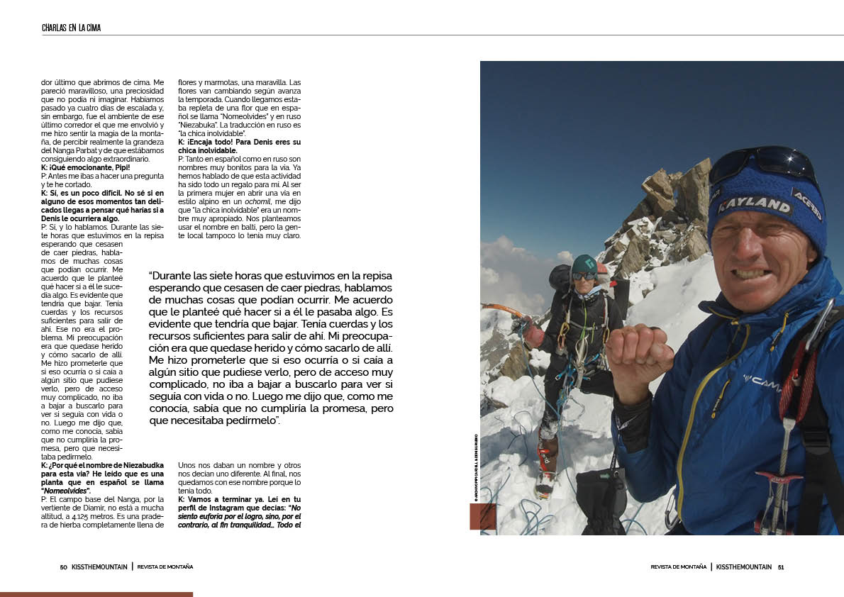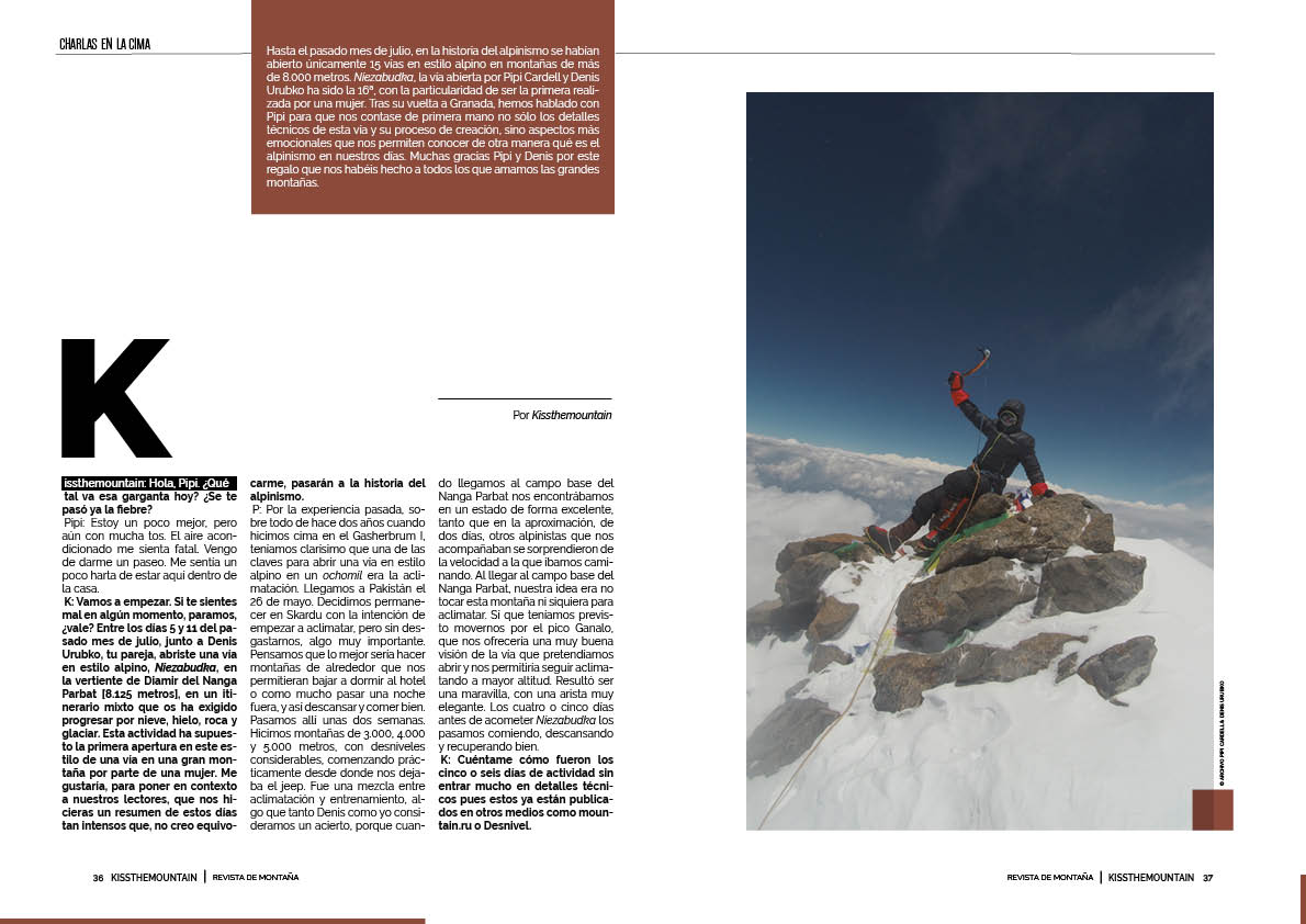 K: Vamos a empezar. Si te sientes mal en algún momento, paramos, ¿vale? Entre los días 5 y 11 del pasado mes de julio, junto a Denis Urubko, tu pareja, abriste una vía en estilo alpino, Niezabudka, en la vertiente de Diamir del Nanga Parbat [8.125 metros], en un itinerario mixto que os ha exigido progresar por nieve, hielo, roca y glaciar. Esta actividad ha supuesto la primera apertura en este estilo de una vía en una gran montaña por parte de una mujer. Me gustaría, para poner en contexto a nuestros lectores, que nos hicieras un resumen de estos días tan intensos que, no creo equivocarme, pasarán a la historia del alpinismo.