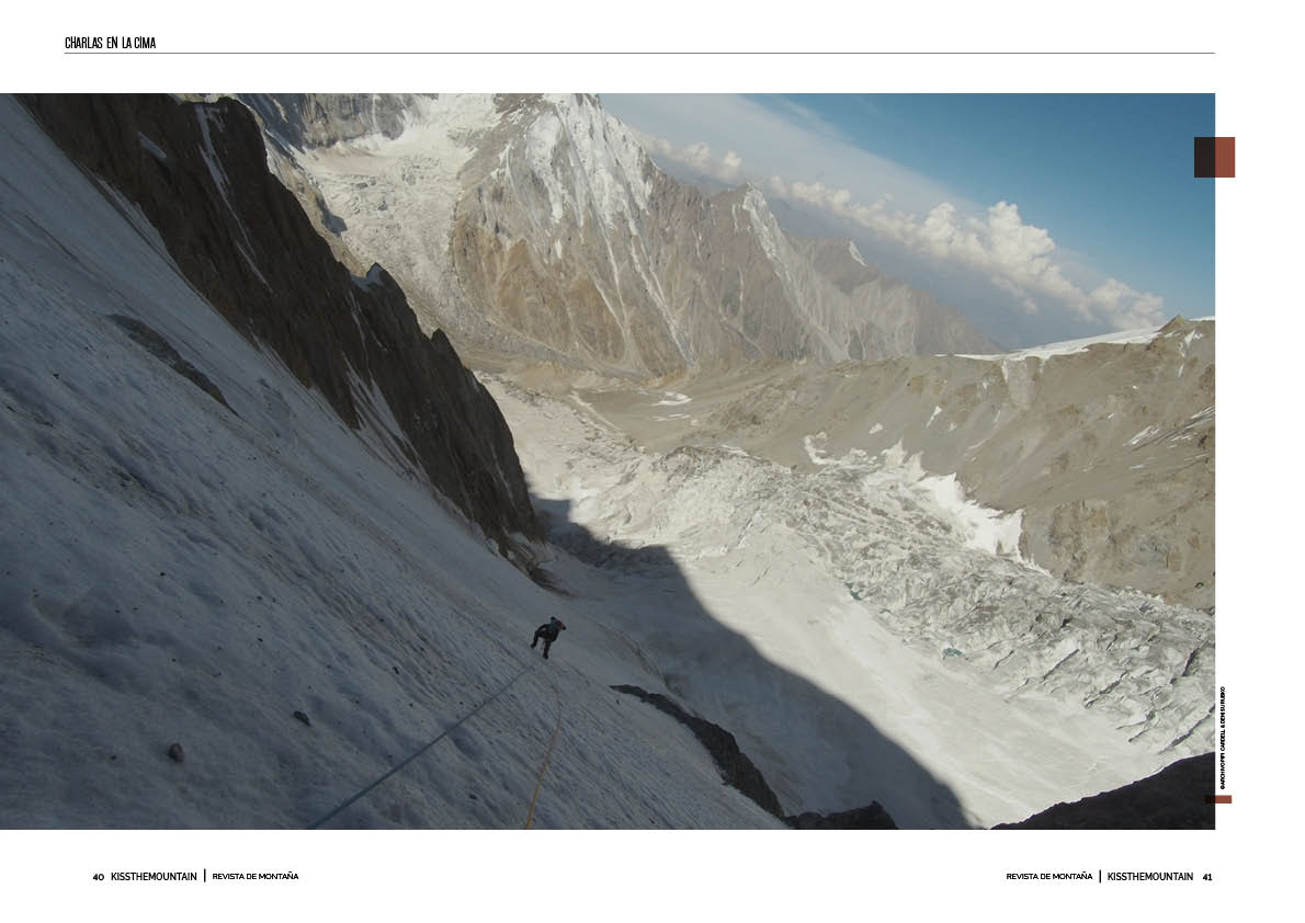 P: Sí, y lo hablamos. Durante las siete horas que estuvimos en la repisa esperando que cesasen de caer piedras, hablamos de muchas cosas que podían ocurrir. Me acuerdo que le planteé qué hacer si a él le sucedía algo. Es evidente que tendría que bajar. Tenía cuerdas y los recursos suficientes para salir de ahí. Ese no era el problema. Mi preocupación era que quedase herido y cómo sacarlo de allí. Me hizo prometerle que si eso ocurría o si caía a algún sitio que pudiese verlo, pero de acceso muy complicado, no iba a bajar a buscarlo para ver si seguía con vida o no. Luego me dijo que, como me conocía, sabía que no cumpliría la promesa, pero que necesitaba pedírmelo.