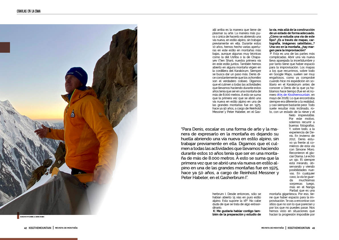 P: Esto se corresponde con el estilo de alpinismo que llevamos haciendo Denis y yo desde hace ya 10 años. Siempre ha sido su modus operandi. Para él, escalar es una forma de arte y la forma de expresarlo en la montaña es dejando su huella. La línea que establece allí arriba es la manera que tiene de plasmar su arte. La manera más pura o única de hacerlo es abriendo una vía nueva, en estilo alpino, sin trabajar previamente en ella. Durante estos 10 años, hemos hecho varias aperturas en este estilo en montañas más bajas, aunque algunas muy técnicas como la del Ushba o la de Chapayev (Tien Shan), nuestra primera vía en este estilo juntos. También hemos abierto en alguna montaña virgen en la cordillera del Karakórum. Siempre se busca dar un paso más. Denis dice constantemente que los ochomiles son el verdadero coliseo. Digamos que el culmen a todas las actividades que llevamos haciendo durante estos años tenía que ser en una montaña de más de 8.000 metros. A esto se suma que la primera vez que se abrió una vía nueva en estilo alpino en una de las grandes montañas fue en 1975, hace ya 50 años, a cargo de Reinhold Messner y Peter Habeler, en el Gasherbrum I. Desde entonces, sólo se habían abierto 15 vías en puro estilo alpino. Esta supone la 16ª. No cabe duda de que se trata de algo extraordinario.