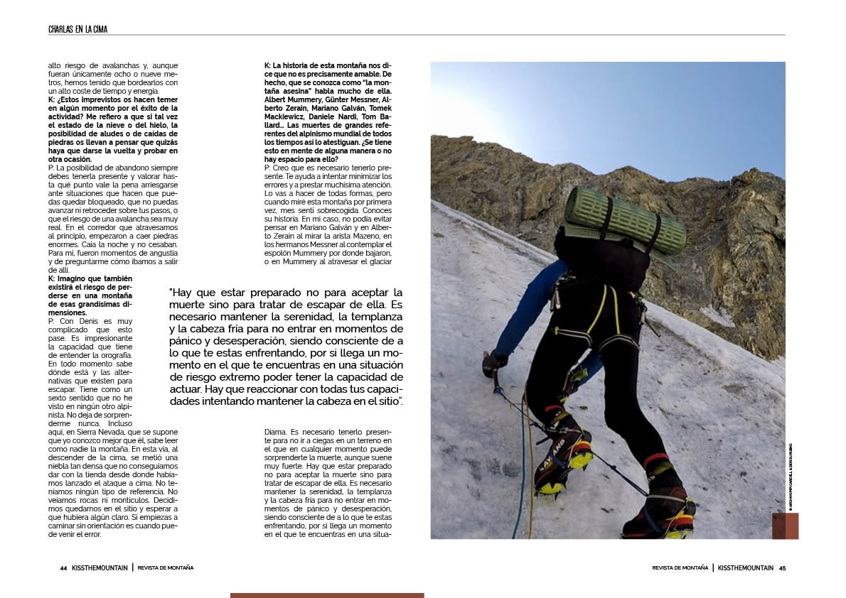 K: Y la historia. Supongo que también caerá esa nominación al Piolet d’Or francés. Pipi, me gustaría profundizar muchísimo más sobre esta actividad, pero no cabría en un único artículo. Cuando vuelva Denis a Granada, que creo que me dijiste que será en octubre, quedamos un día los tres y nos tomamos una cerveza.