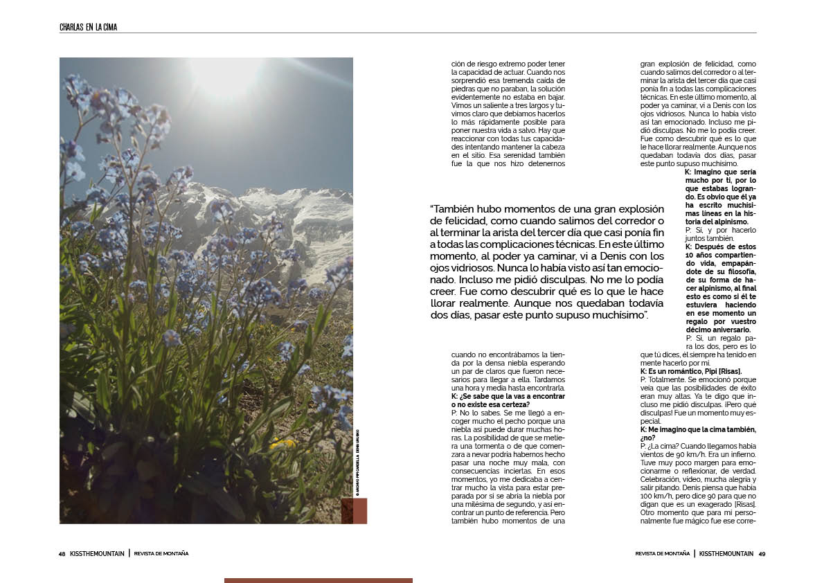 K: Vamos a terminar ya. Leí en tu perfil de Instagram que decías: “No siento euforia por el logro, sino, por el contrario, al fin tranquilidad… Todo el esfuerzo pasado encaja como piezas en un puzle. Nuestro sueño personal se ha completado y es tiempo de observar la realidad. El resto llegará de la mano”. Igualmente, me da como la impresión de que no le das el suficiente valor a lo que como mujer has hecho, sobre todo, si tenemos en cuenta que, en 50 años, esta es únicamente la 16ª vía abierta en estilo alpino en una gran montaña…