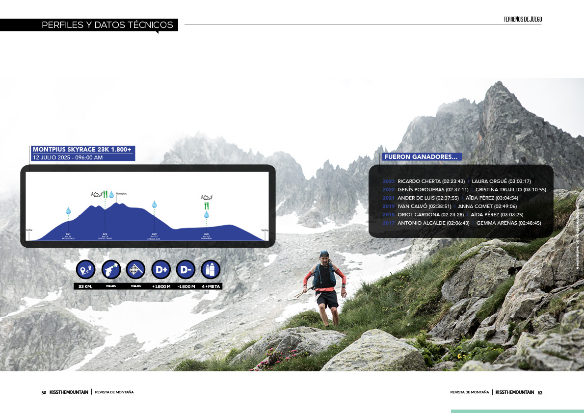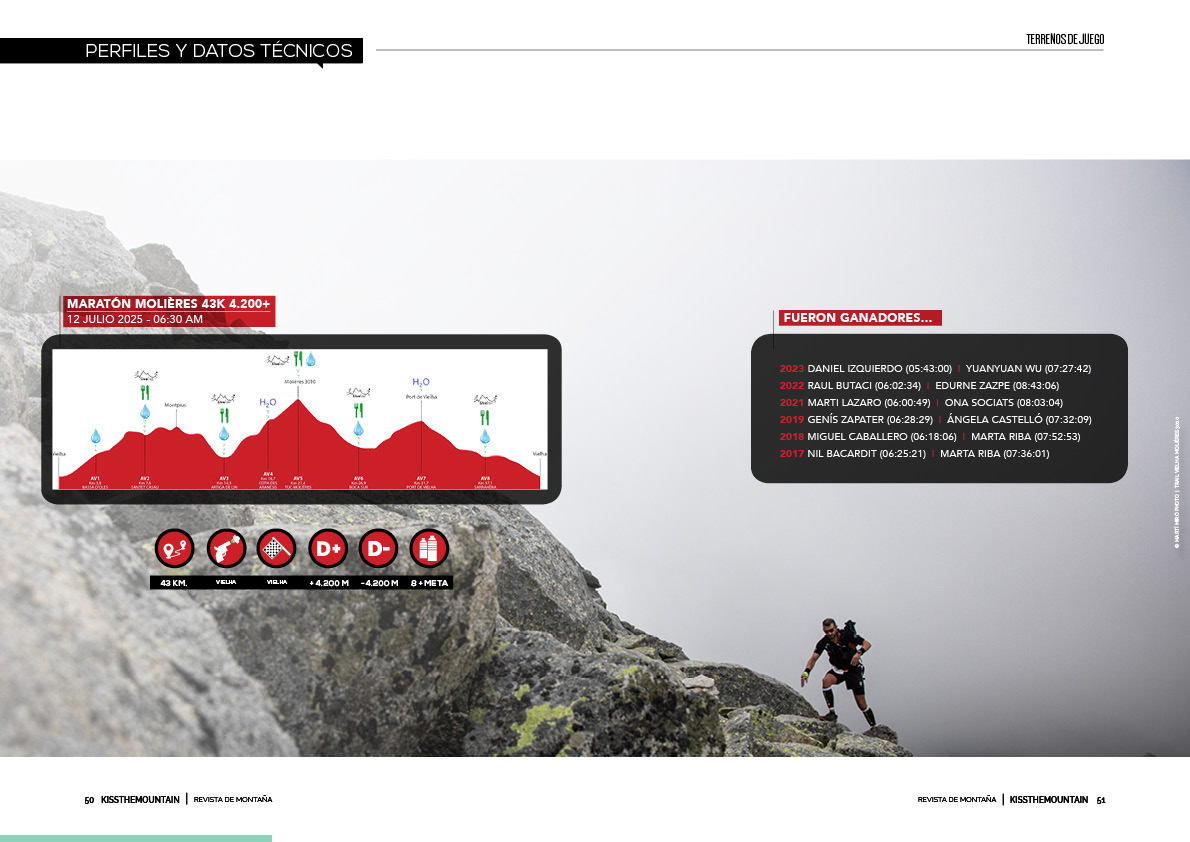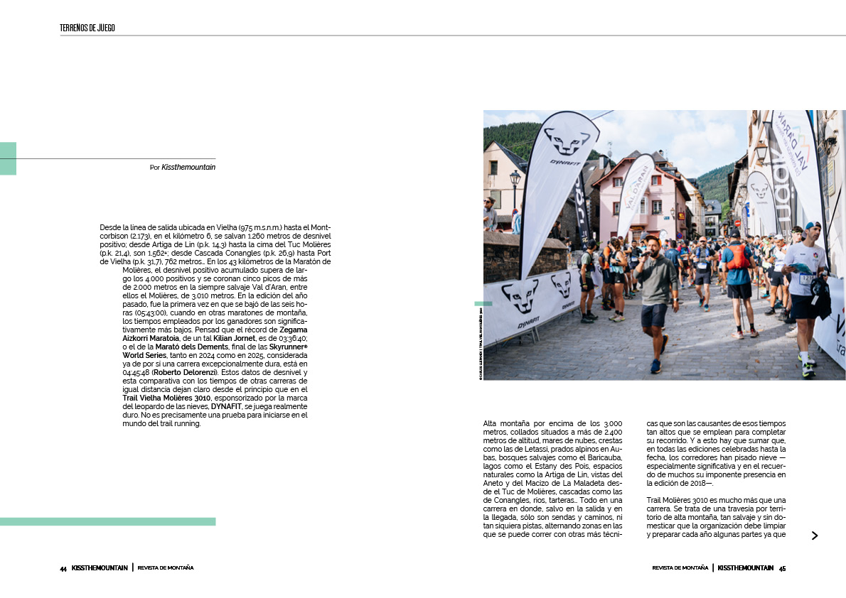 Desde la línea de salida ubicada en Vielha (975 m.s.n.m.) hasta el Montcorbison (2.173), en el kilómetro 6, se salvan 1.260 metros de desnivel positivo; desde Artiga de Lin (p.k. 14,3) hasta la cima del Tuc Molières (p.k. 21,4), son 1.562+; desde Cascada Conangles (p.k. 26,9) hasta Port de Vielha (p.k. 31,7), 762 metros… En los 43 kilómetros de la Maratón de Molières, el desnivel positivo acumulado supera de largo los 4.000 positivos y se coronan cinco picos de más de 2.000 metros en la siempre salvaje Val d’Aran, entre ellos el Molières, de 3.010 metros. En la edición del año pasado, fue la primera vez en que se bajó de las seis horas (05:43:00), cuando en otras maratones de montaña, los tiempos empleados por los ganadores son significativamente más bajos. Pensad que el récord de Zegama Aizkorri Maratoia, de un tal Kilian Jornet, es de 03:36:40; o el de la Marató dels Dements, final de las Skyrunner® World Series, tanto en 2024 como en 2025, considerada ya de por sí una carrera excepcionalmente dura, está en 04:45:48 (Roberto Delorenzi). Estos datos de desnivel y esta comparativa con los tiempos de otras carreras de igual distancia dejan claro desde el principio que en el Trail Vielha Molières 3010, esponsorizado por la marca del leopardo de las nieves, DYNAFIT, se juega realmente duro. No es precisamente una prueba para iniciarse en el mundo del trail running.