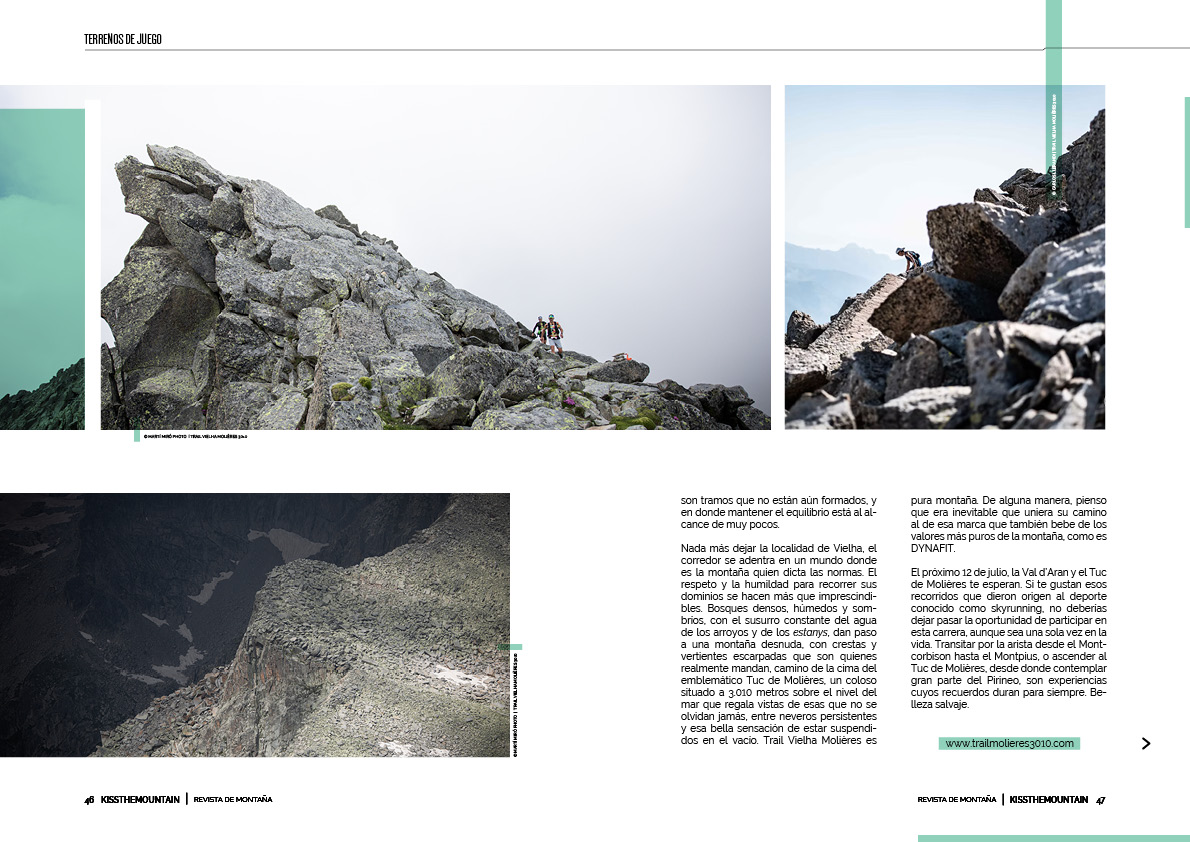 Nada más dejar la localidad de Vielha, el corredor se adentra en un mundo donde es la montaña quien dicta las normas. El respeto y la humildad para recorrer sus dominios se hacen más que imprescindibles. Bosques densos, húmedos y sombríos, con el susurro constante del agua de los arroyos y de los estanys, dan paso a una montaña desnuda, con crestas y vertientes escarpadas que son quienes realmente mandan, camino de la cima del emblemático Tuc de Molières, un coloso situado a 3.010 metros sobre el nivel del mar que regala vistas de esas que no se olvidan jamás, entre neveros persistentes y esa bella sensación de estar suspendidos en el vacío. Trail Vielha Molières es pura montaña. De alguna manera, pienso que era inevitable que uniera su camino al de esa marca que también bebe de los valores más puros de la montaña, como es DYNAFIT.