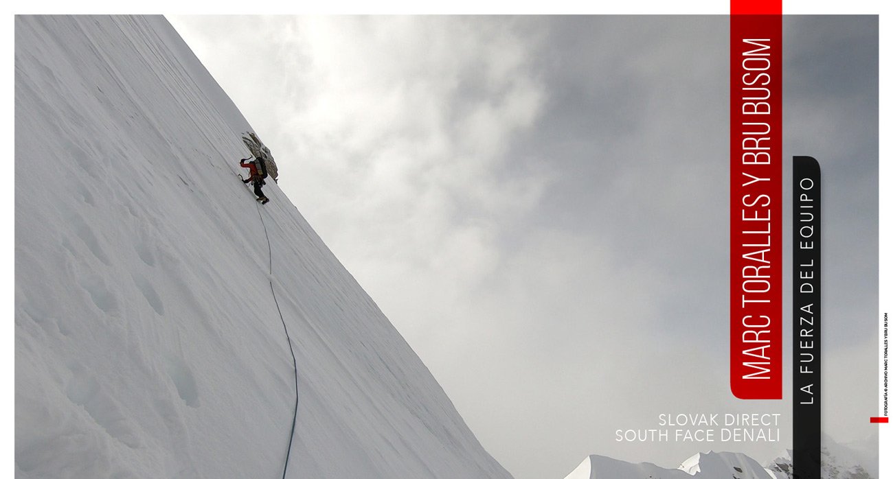 En este artículo, el hecho de que “Slovak Direct” figure como subtítulo del mismo y no como título principal no es casualidad, porque aunque en esta actividad -que asciende 2.750 metros de desnivel en la cara sur del Denali, la montaña más alta de América del Norte con 6.190 metros- sea uno de los principales protagonistas, para nosotros lo es más la cordada formada por Bru Busom y Marc Toralles, guías de montaña de profesión, y que hace unos meses realizaron la décima ascensión por esta espectacular vía.